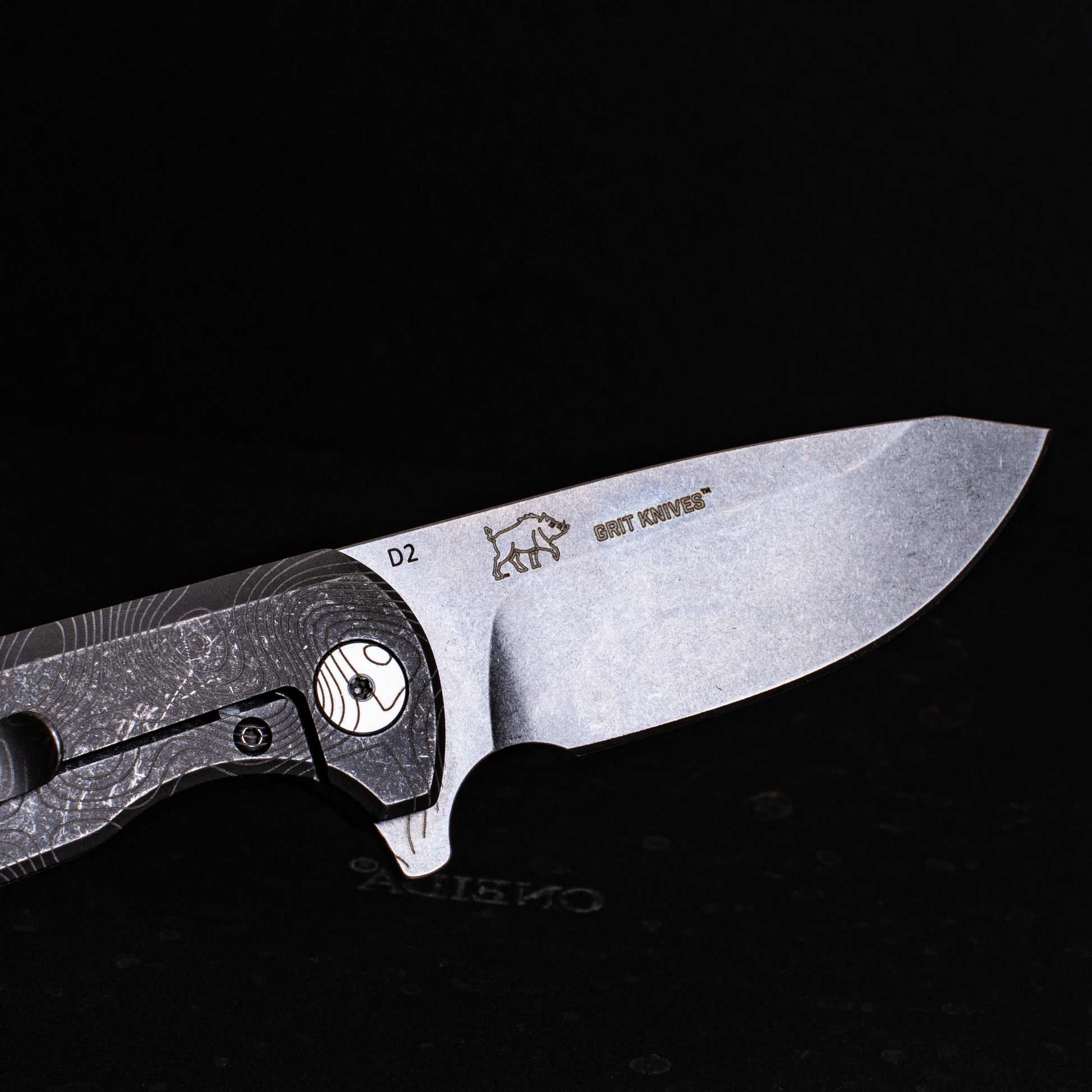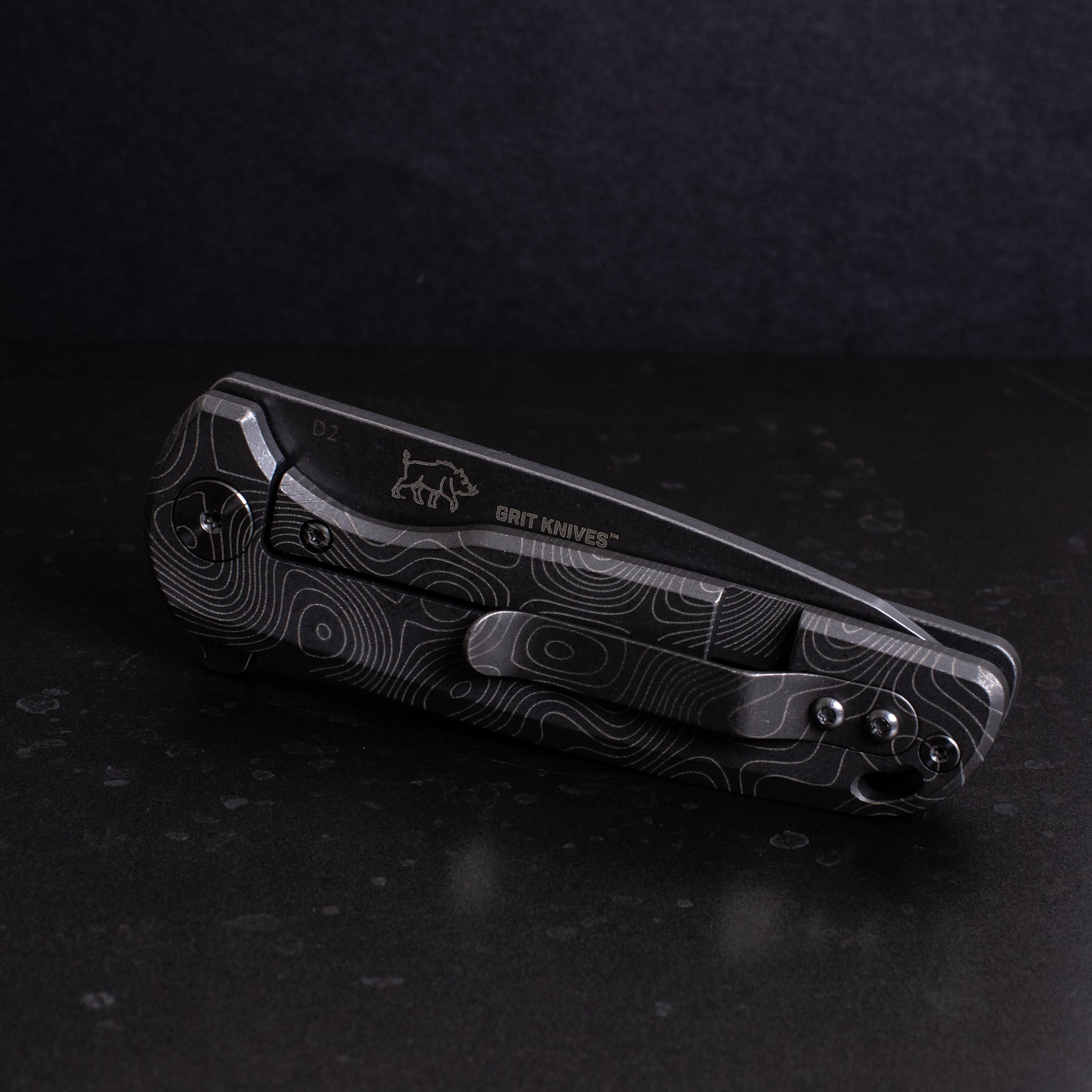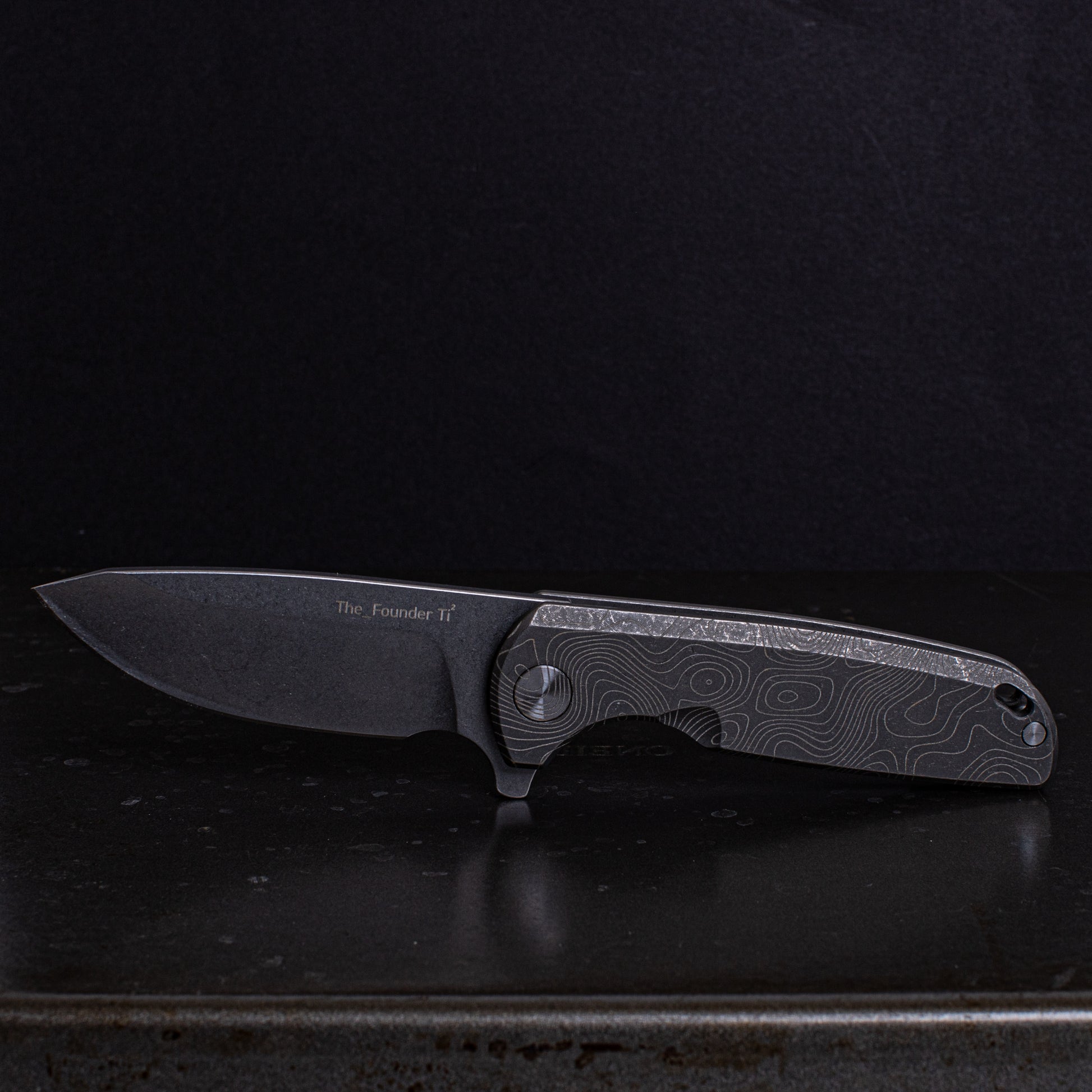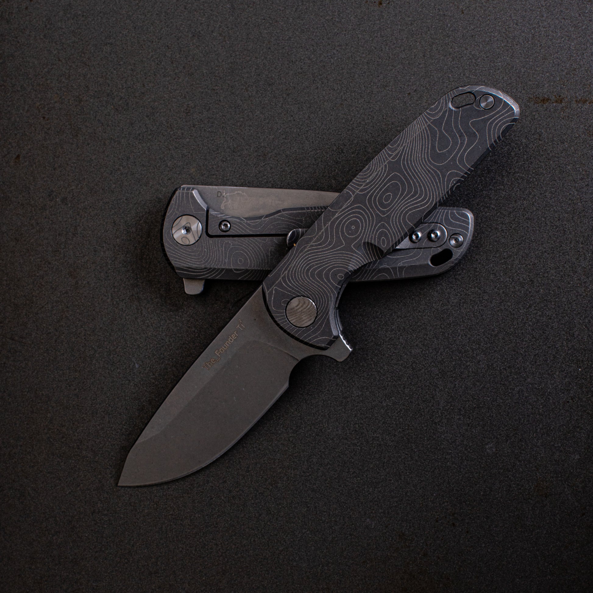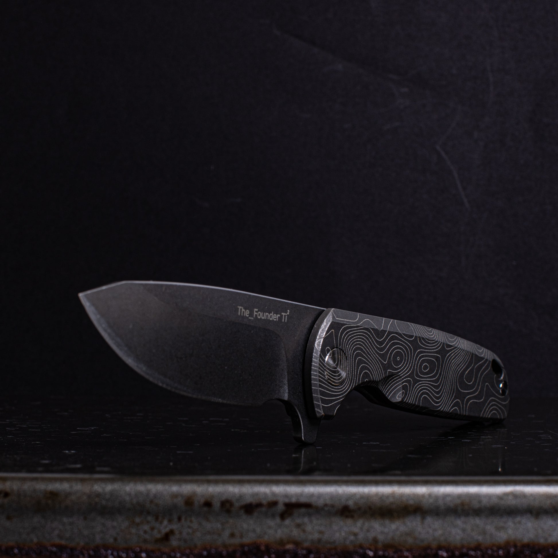 Introducing the limited edition The_Founder Ti² with a topo engraved handle, a truly exceptional knife that combines unparalleled beauty and functionality. This exquisite blade showcases a hardness rating of D2, meticulously polished to perfection through advanced CNC machining techniques. The meticulous polishing process enhances not only its cutting prowess but also its visual appeal, making it a true collector's item.