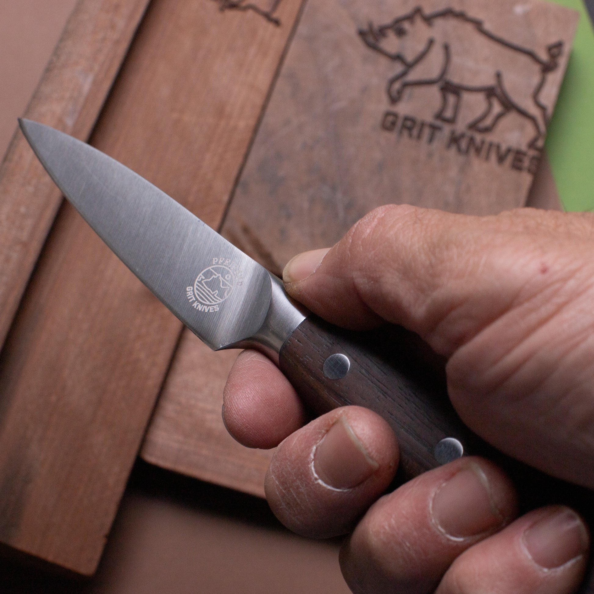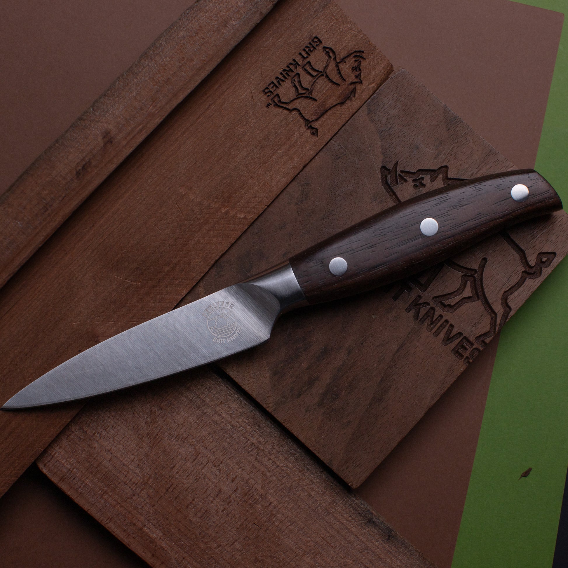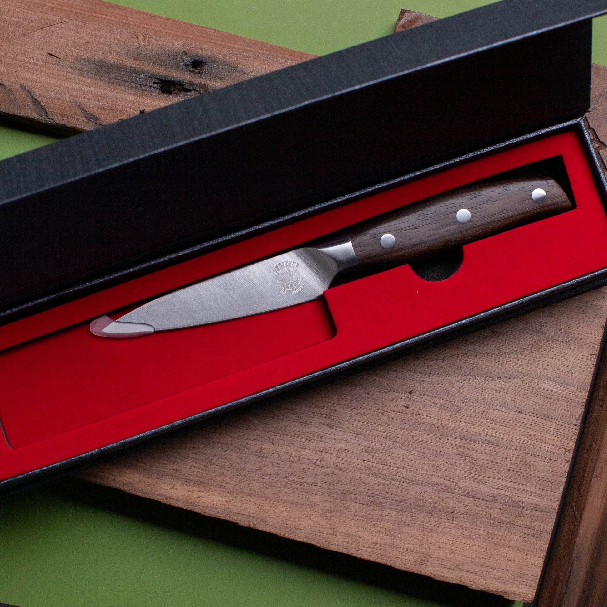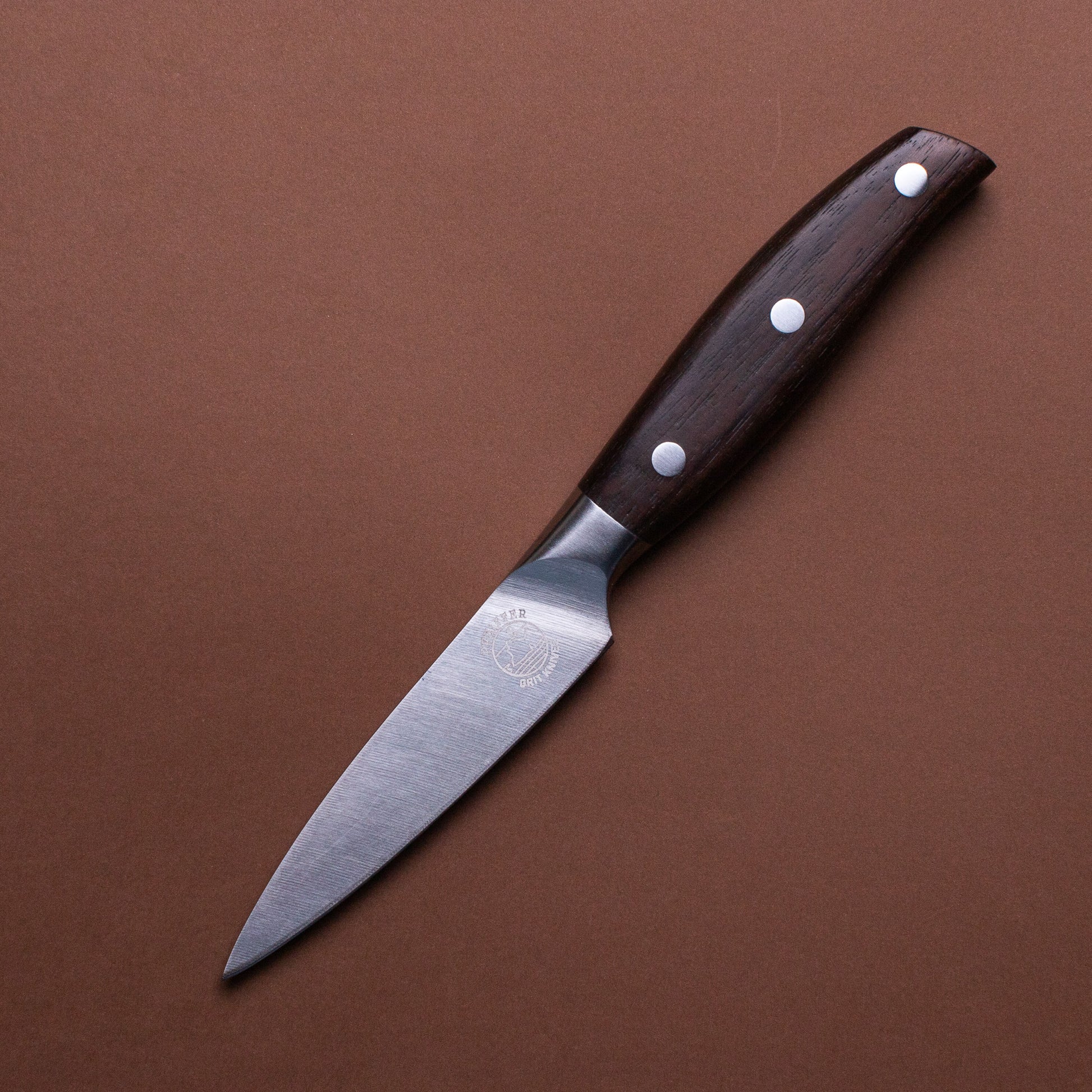 Featuring a 3.75-inch blade with a razor-sharp edge, its 0.047-inch thickness ensures nimble precision, whether you’re peeling, slicing, or coring. The blade’s fine craftsmanship is complemented by a stunning red sandalwood handle, offering a warm, natural feel and a secure grip that balances perfectly in your hand.